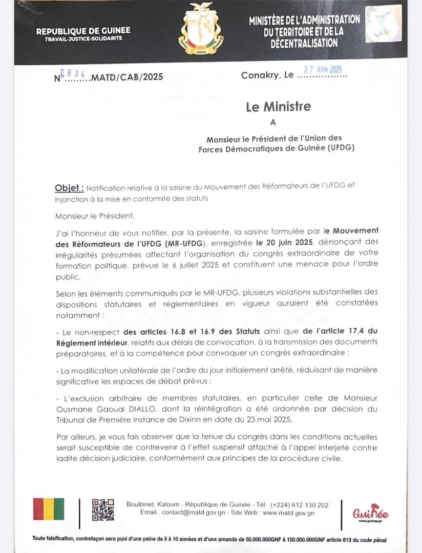 C’est une décision qui vient freiner l’élan de l’Union des forces démocratiques de Guinée (UFDG), dans le processus d’organisation de son congrès national. Dans une note consultée par notre rédaction ce vendredi 27 juin 2025, le ministère de l’Administration du territoire et de la Décentralisation (MATD) a demandé à Cellou Dalein Diallo, président de l’Union des forces démocratiques de Guinée (UFDG), de surseoir à la tenue du congrès prévu le 6 juillet prochain.